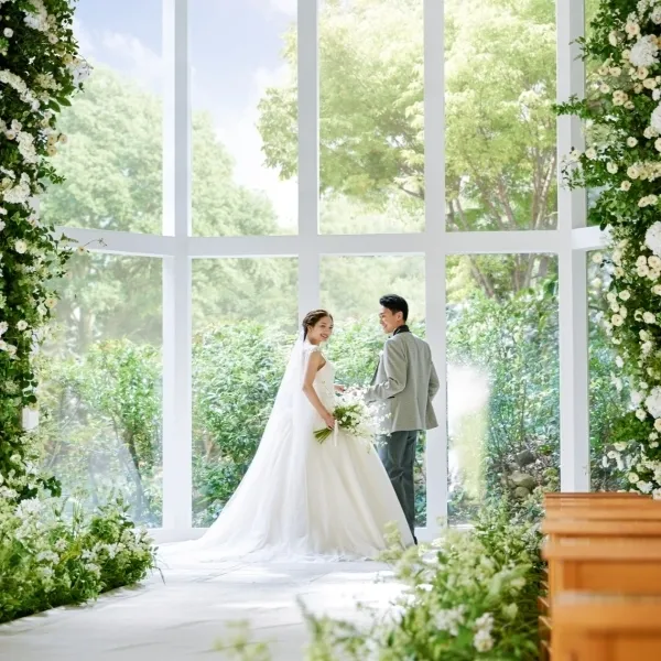 【リニューアル】光に包まれる温かなFLOWERチャペル入場を体感。花と緑に囲まれ、自然の光が二人を包む上質なチャペルで、実際の入場シーンを再現。